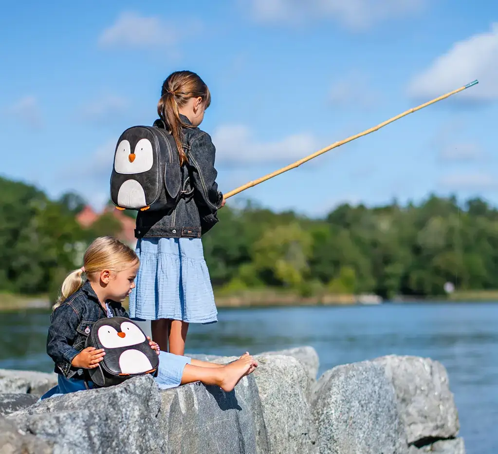 Slitstark ryggsäck i veganskt läder med reglerbara axelremmar som är långa nog att passa både små och stora ryggar. Denna gulliga ryggsäck utformad som en pingvin, rymmer alltifrån matsäck och mössa till skolböcker. Pingvinen Mini är utrustad med fina detaljer i form av små fenor och fötter. På insidan finns ett litet fack med blixtlås för särskilt värdefulla små skatter. Ryggsäcken är fri från PFAS och ett hållbart val för både små och stora äventyrare! Vill du lära känna Mini lite bättre? Skrolla ner för att läsa mer om hen och hitta fullständig produktinformation.